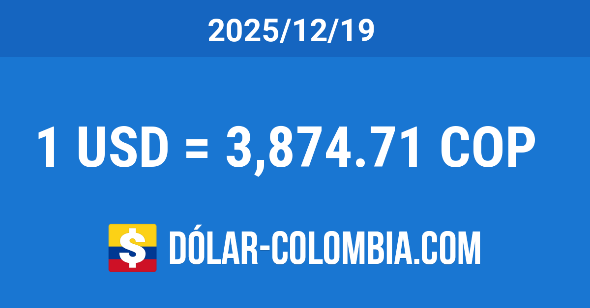 La cotización del dólar en Colombia para el día Viernes 19 de Diciembre del 2025 subió 7.94 Pesos, correspondiente a un aumento del 0.21% con respecto al día anterior. Alcanzó el nivel más alto en más de un mes (desde 2025-10-30). La TRM disminuyó un 11.11% (484.4 Pesos) en referencia al mismo día del año anterior, pero subió un 3.67% (137.16 Pesos) comparando con el mismo día del mes anterior.