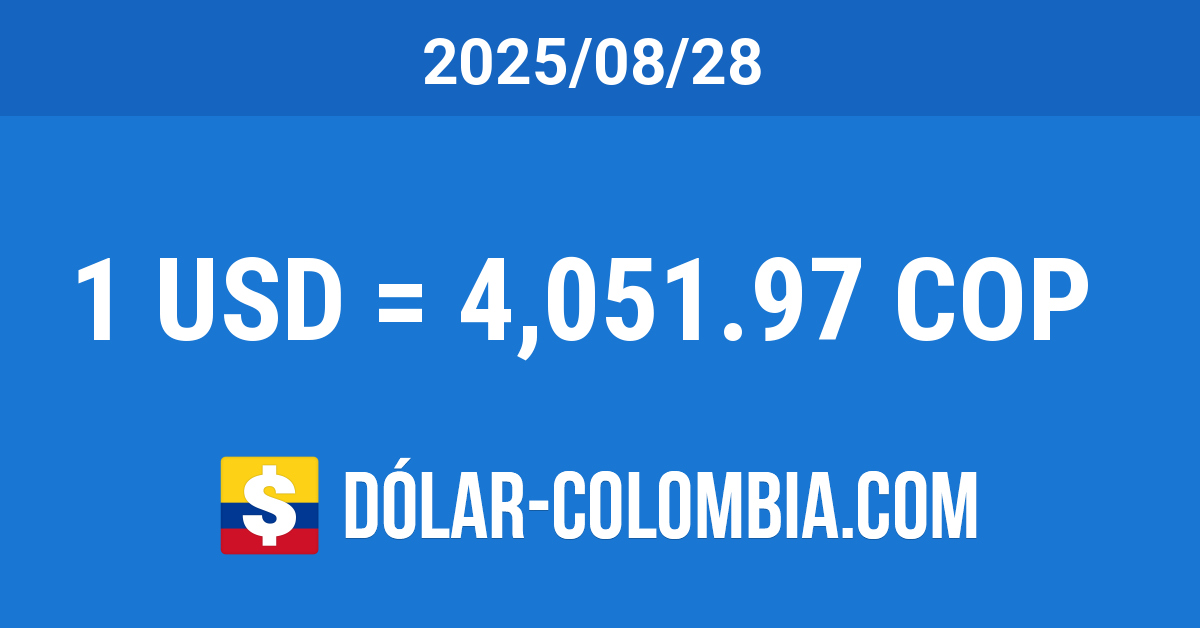 La cotización del dólar en Colombia para el día Jueves 28 de Agosto del 2025 subió 7.46 Pesos, correspondiente a un aumento del 0.18% con respecto al día anterior. Alcanzó el nivel más alto en más de 3 semanas (desde 2025-08-06). La TRM aumentó un 0.16% (6.33 Pesos) en referencia al mismo día del año anterior, pero se redujo un 1.42% (58.51 Pesos) comparando con el mismo día del mes anterior.