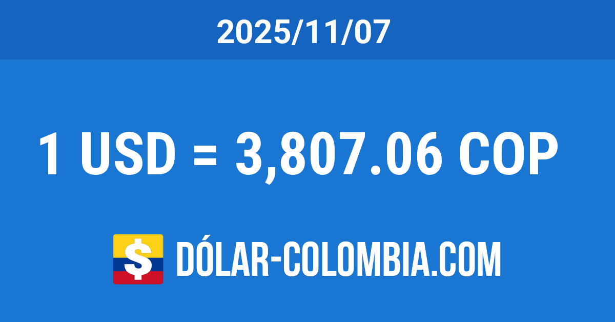 La cotización del dólar en Colombia para el día Viernes 7 de Noviembre del 2025 bajó 32.41 Pesos, equivalente a un descenso del 0.84% con respecto al día anterior. Alcanzó el nivel más bajo en más de un año (desde 2024-04-10). La TRM disminuyó un 14.07% (623.34 Pesos) en referencia al mismo día del año anterior y se redujo un 1.2% (46.13 Pesos) comparando con el mismo día del mes anterior.