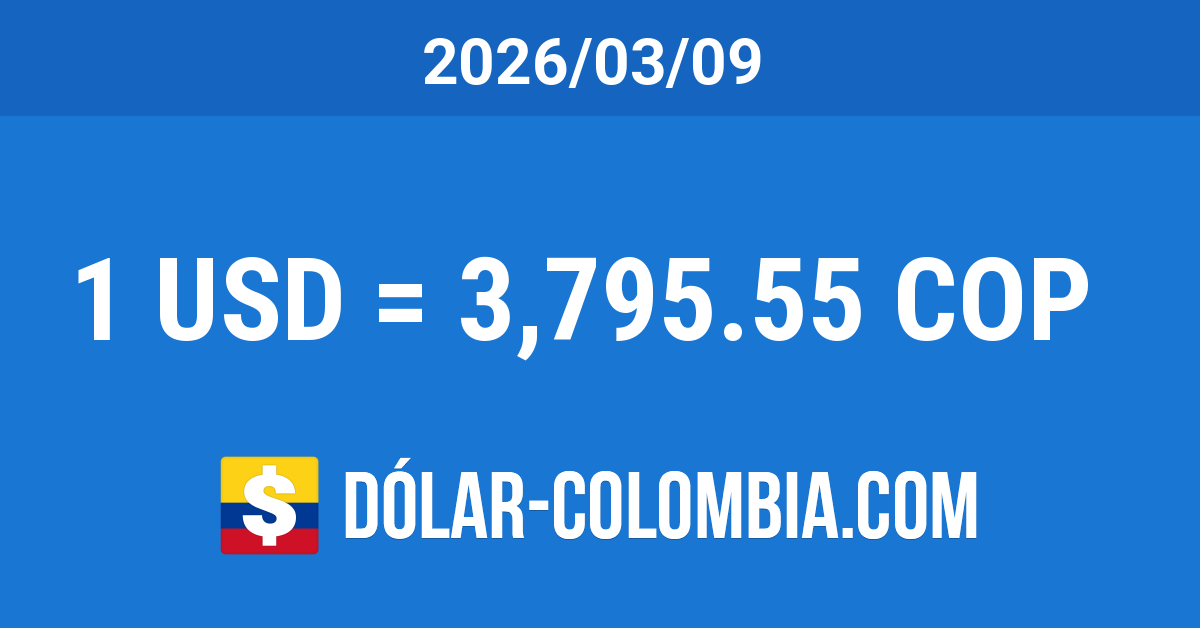 La cotización del dólar en Colombia para el día Lunes 9 de Marzo del 2026 se mantuvo inalterada. La TRM disminuyó un 7.8% (321.25 Pesos) en referencia al mismo día del año anterior, pero subió un 3.42% (125.35 Pesos) comparando con el mismo día del mes anterior.