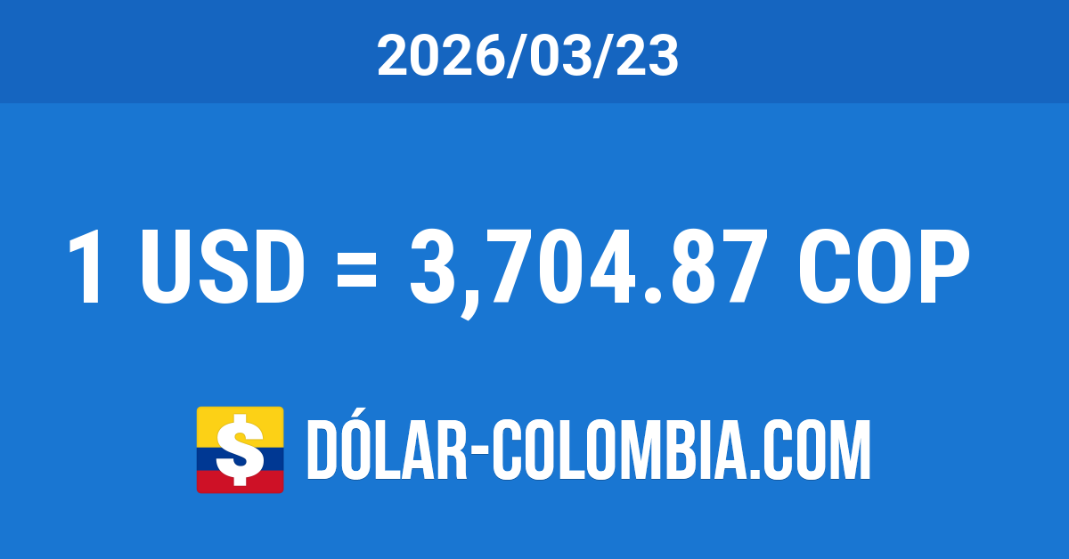 La cotización del dólar en Colombia para el día Lunes 23 de Marzo del 2026 se mantuvo inalterada. La TRM disminuyó un 11.13% (463.95 Pesos) en referencia al mismo día del año anterior, pero subió un 0.37% (13.53 Pesos) comparando con el mismo día del mes anterior.