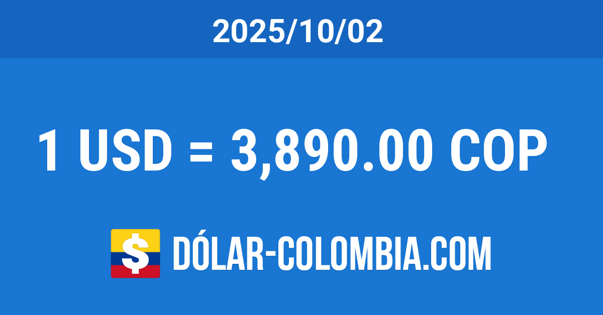 La cotización del dólar en Colombia para el día Jueves 2 de Octubre del 2025 bajó 33.55 Pesos, equivalente a un descenso del 0.86% con respecto al día anterior. La TRM disminuyó un 7.91% (334.21 Pesos) en referencia al mismo día del año anterior y se redujo un 3.2% (128.41 Pesos) comparando con el mismo día del mes anterior.