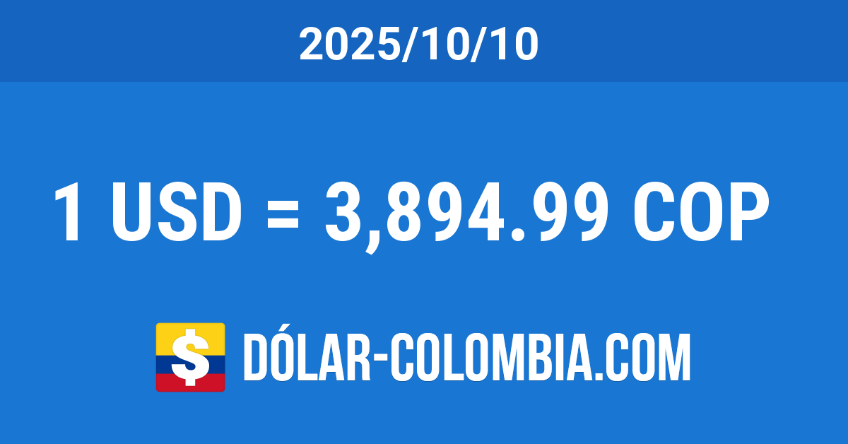 La cotización del dólar en Colombia para el día Viernes 10 de Octubre del 2025 subió 15.19 Pesos, correspondiente a un aumento del 0.39% con respecto al día anterior. La TRM disminuyó un 7.99% (338.18 Pesos) en referencia al mismo día del año anterior y se redujo un 0.62% (24.14 Pesos) comparando con el mismo día del mes anterior.