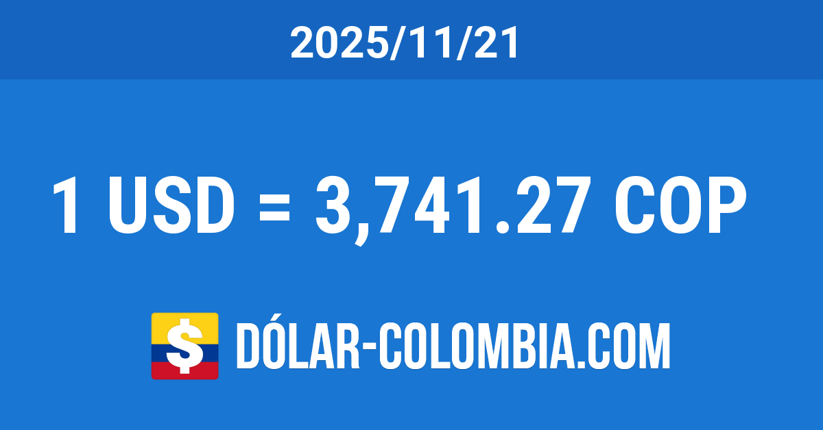 La cotización del dólar en Colombia para el día Viernes 21 de Noviembre del 2025 subió 24.54 Pesos, correspondiente a un aumento del 0.66% con respecto al día anterior. La TRM disminuyó un 15.24% (672.79 Pesos) en referencia al mismo día del año anterior y se redujo un 3.51% (135.99 Pesos) comparando con el mismo día del mes anterior.