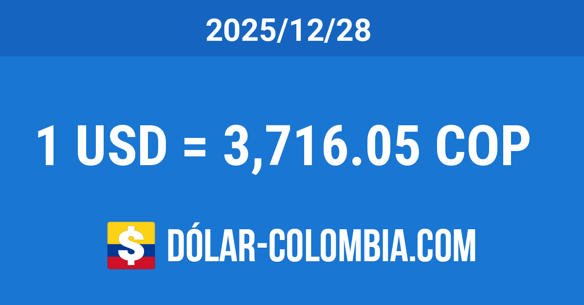 La cotización del dólar en Colombia para el día Domingo 28 de Diciembre del 2025 se mantuvo inalterada. La TRM disminuyó un 15.58% (685.93 Pesos) en referencia al mismo día del año anterior y se redujo un 1.53% (57.55 Pesos) comparando con el mismo día del mes anterior.