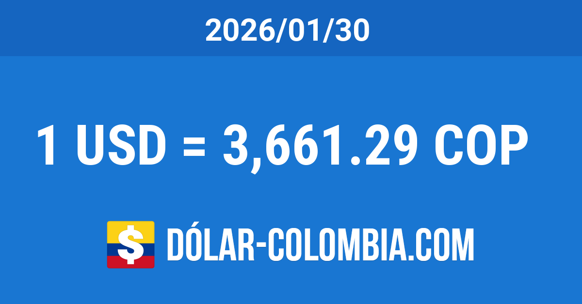 La cotización del dólar en Colombia para el día Viernes 30 de Enero del 2026 bajó 4.68 Pesos, equivalente a un descenso del 0.13% con respecto al día anterior. La TRM disminuyó un 12.74% (534.31 Pesos) en referencia al mismo día del año anterior y se redujo un 1.23% (45.68 Pesos) comparando con el mismo día del mes anterior.