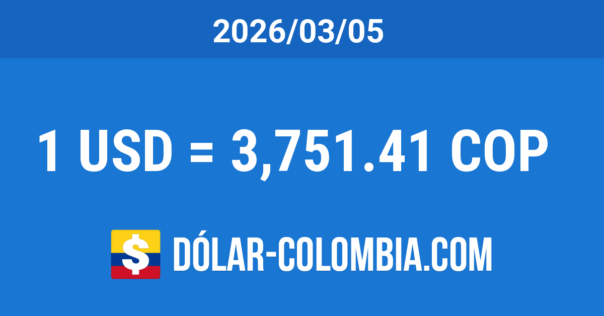 La cotización del dólar en Colombia para el día Jueves 5 de Marzo del 2026 bajó 46.23 Pesos, equivalente a un descenso del 1.22% con respecto al día anterior. La TRM disminuyó un 9.48% (392.77 Pesos) en referencia al mismo día del año anterior, pero subió un 2.92% (106.48 Pesos) comparando con el mismo día del mes anterior.